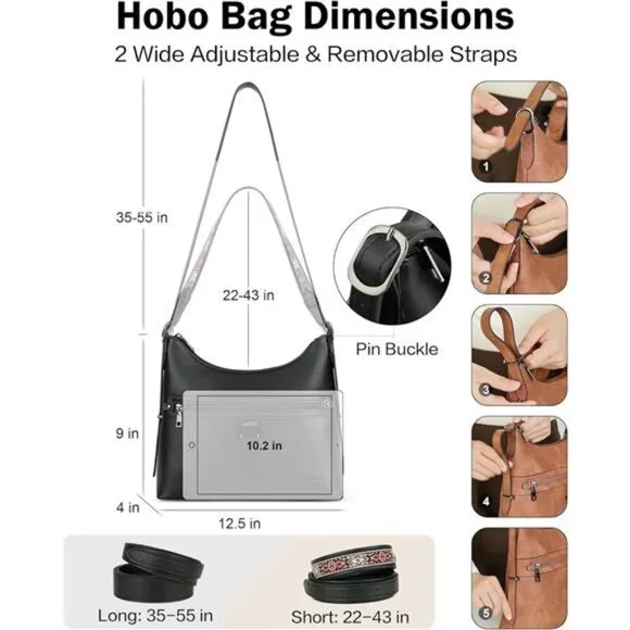 This hobo purse is a foldable soft bottom design and stands upright well with It without anything. This women's purse have 2 removable straps. The short strap allows you to transform the hobo bags into shoulder purse or handbag, and a long strap that can convert the hobo purse into a crossbody purse. Large Capacity Crossbody Purse: Measuring 12.5''W*4"D*9''H, it weighs 2 lb, making it a lightweight women crossbody handbag. It features 8 pockets, including 2 main compartments, 1 front zip pocket, 1 back zip pocket, 2 internal zip pockets, and 2 internal slide pockets, providing ample space to meet your daily needs. This hobo purse allows you to neatly store an 11-in iPad, A5 fire, a smartphone, a power bank, a wallet, cosmetics, and other daily essentials.This women's crossbody bag is crafted from premium vegan leather and intricately hardware. It is effortless to clean, simply wipe it with wet cloth. The zippers have has been tested many times, and the effortless and smoother operation. Premium quality hardware on both sides makes this shoulder purse look more stylish and practical. This enables hobo purses for women to better accompany you, liberate your hands, and transform into a fashionable accessory.