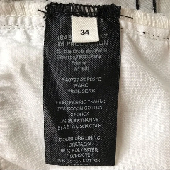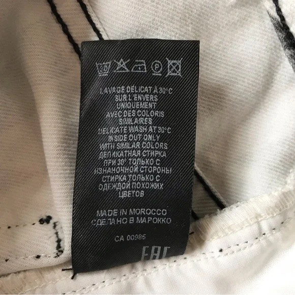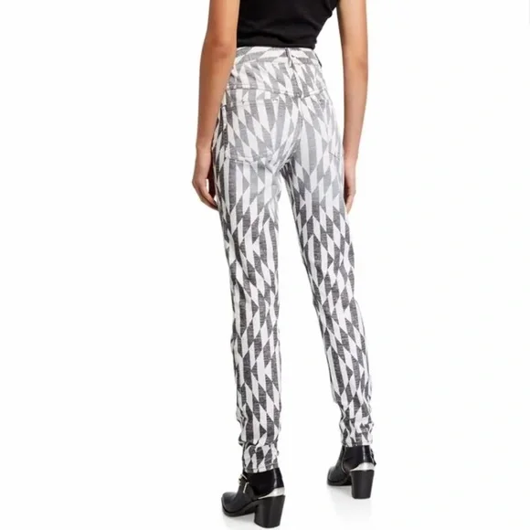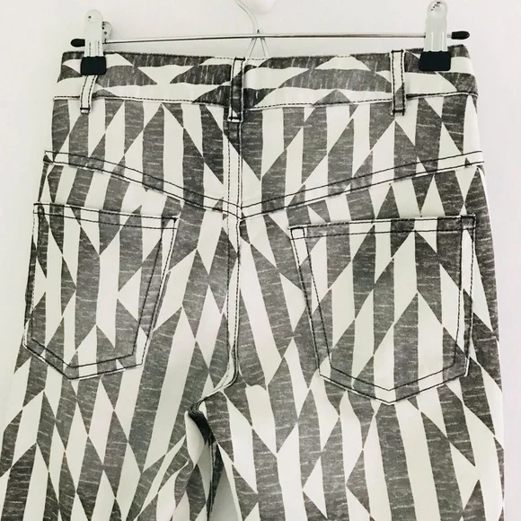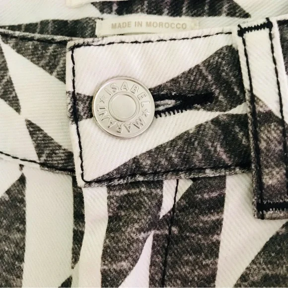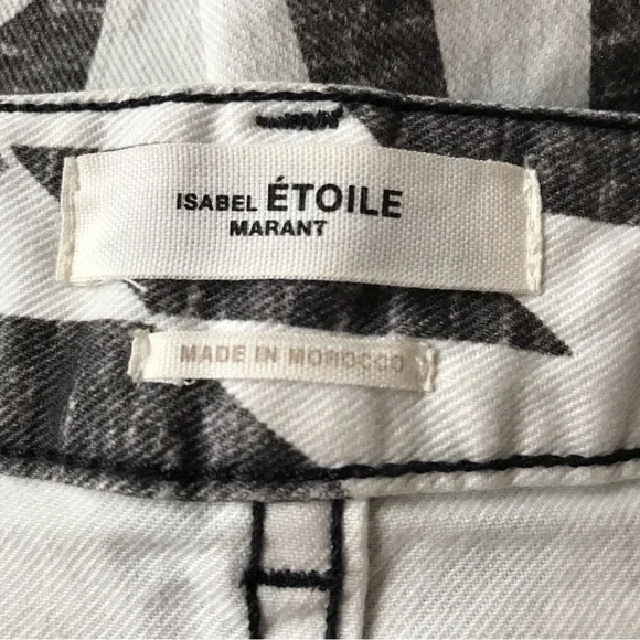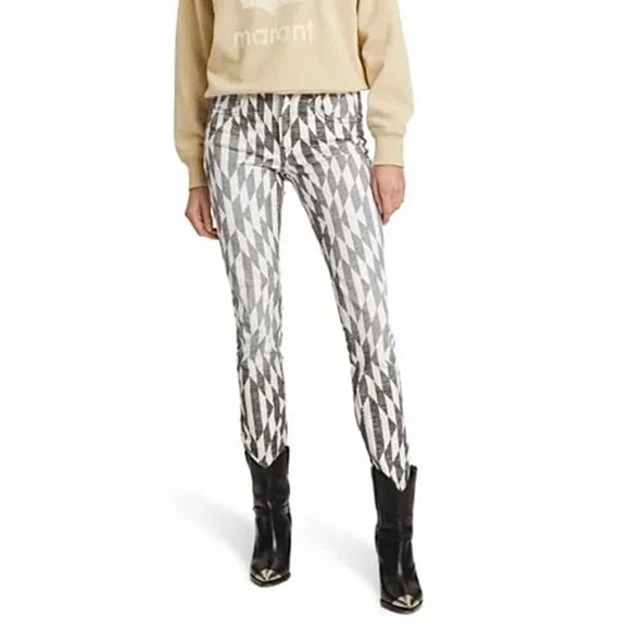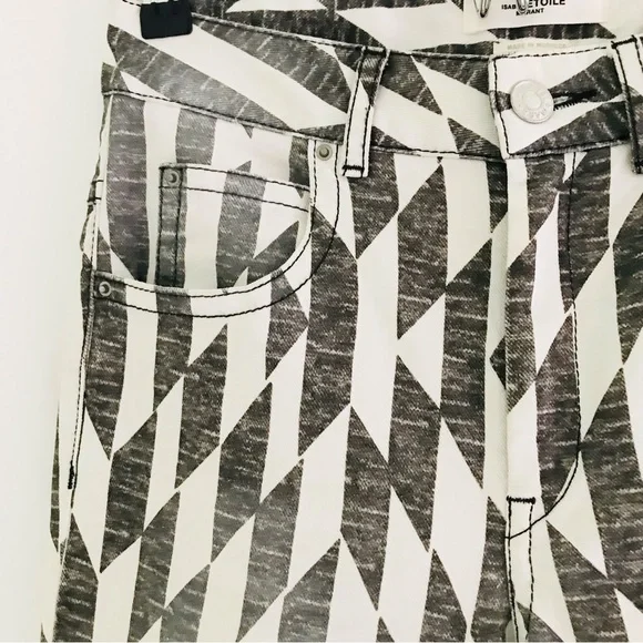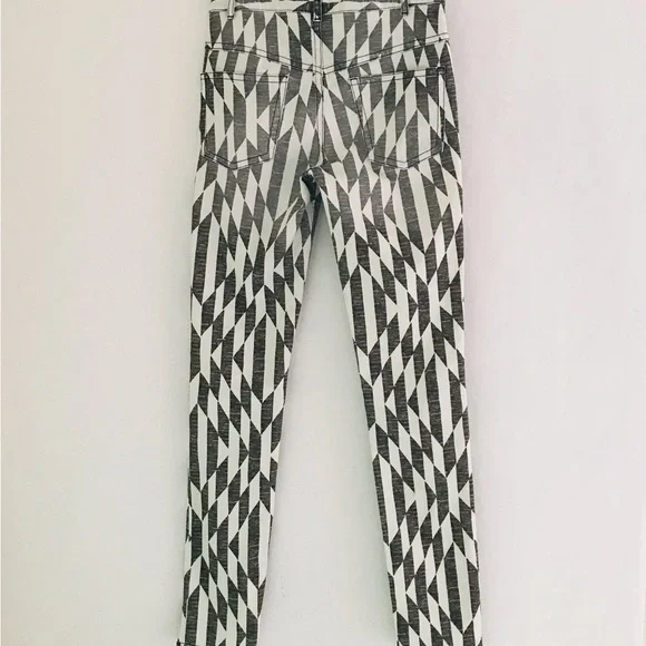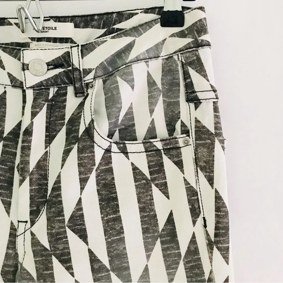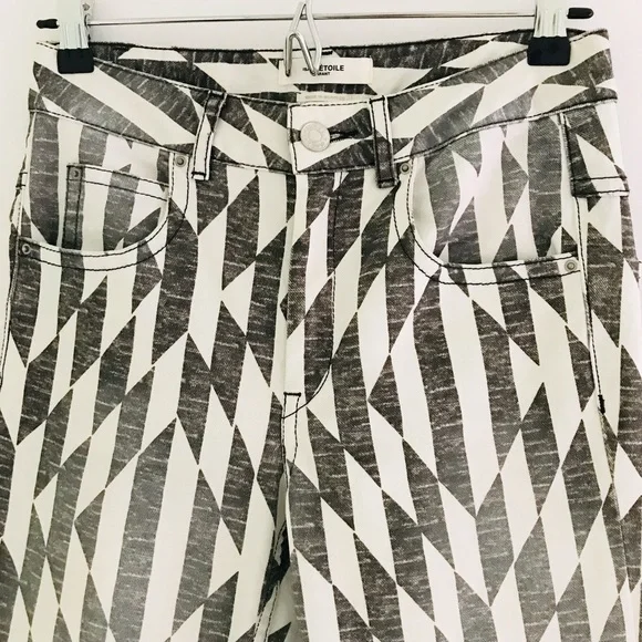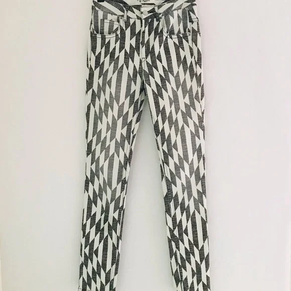 Super chic jeans from Isabel Marant Etoile. Black and White stretch denim. Skinny leg. Distorted harlequin print with diffused fading. 5 pocket design. Zip fly with button closure. Belt loops. Stamped hardware. Cotton/Elastane. French Size 34 - approximately US Size 2 - could also fit some US Size 4, see measurements and check against your own favorite jeans. Waist - 13 1/2”; Inseam - 31”; Rise - 10”. All measurements approximate. EUC