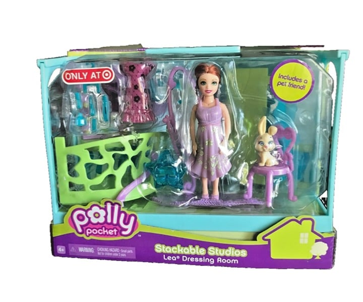 The product is a Polly Pocket 2007 Lea's dressing room stackable studios playset, part of the Polly Pocket franchise by Mattel. This doll playset includes accessories and an animal figure, featuring a 3-inch doll of the character Lea. Packaged in its original unopened box.