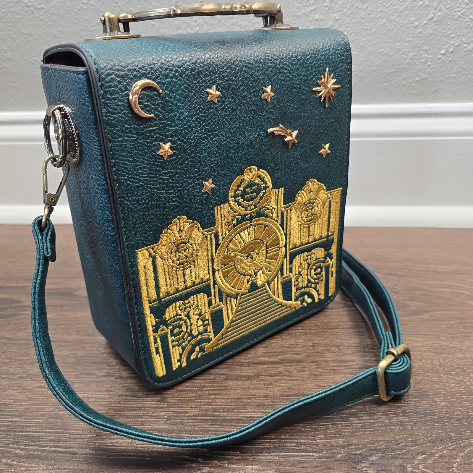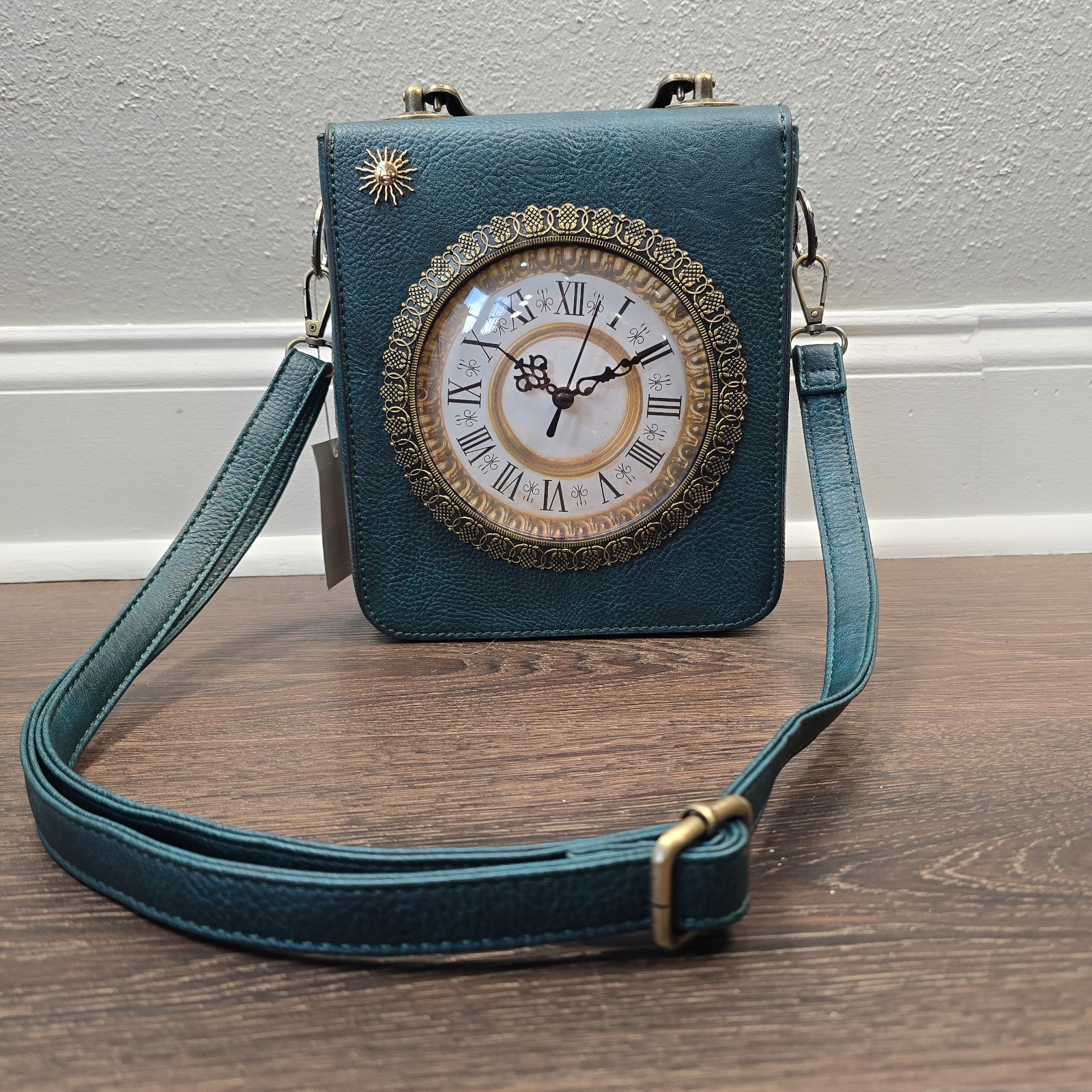 This stunning teal crossbody purse is a true conversation piece — featuring a beautifully detailed working clock on the front with ornate antique-style gold trim. Perfect for collectors, steampunk lovers, or anyone who loves unique statement accessories.