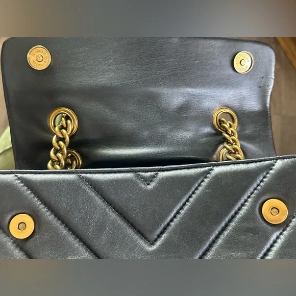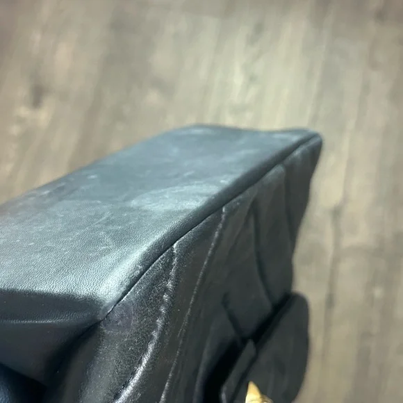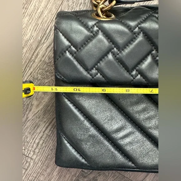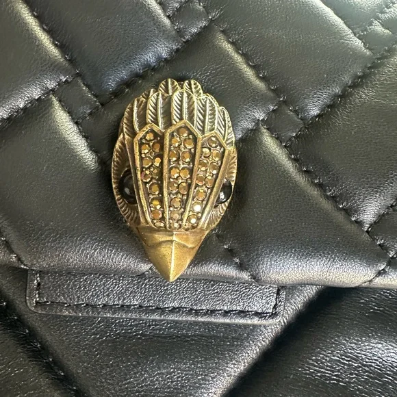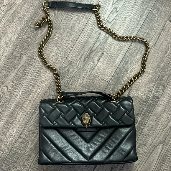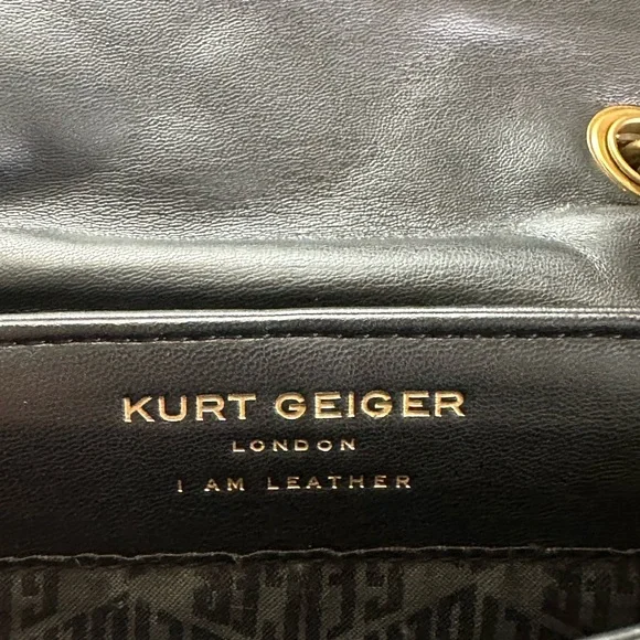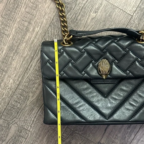 This sophisticated shoulder bag from Kurt Geiger showcases a luxurious black quilted design with a striking gold chain strap. Crafted from premium materials, it features a flap closure with elegant metallic hardware, making it a timeless accessory for any occasion. Please see pictures for wear on purse. Approximate measurements are pictured.