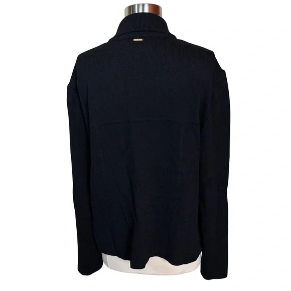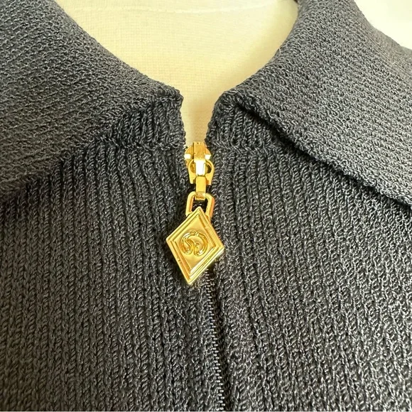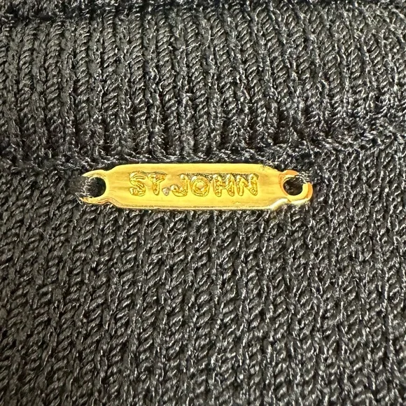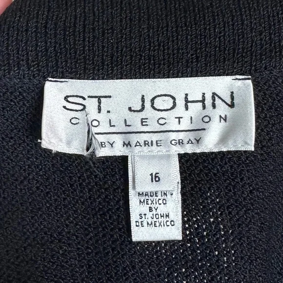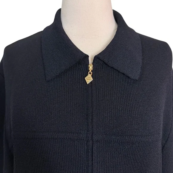 Excellent preowned conditionBrand: St. John CollectionSize: 16Black Santana knit wool & rayon full zip front long sleeve collared jacket with gold hardware - luxurious and perfect basic for capsule wardrobe * all measurements are taken while item is laying flat and are approximate *Bust: 23.5”Waist: 22”Sleeve: 17”Length: 26” from top of shoulder to hem(TJ)