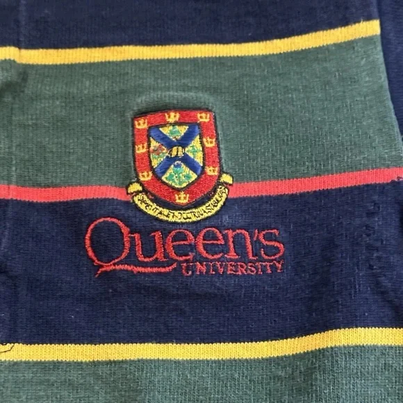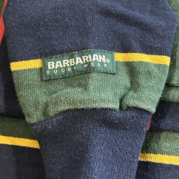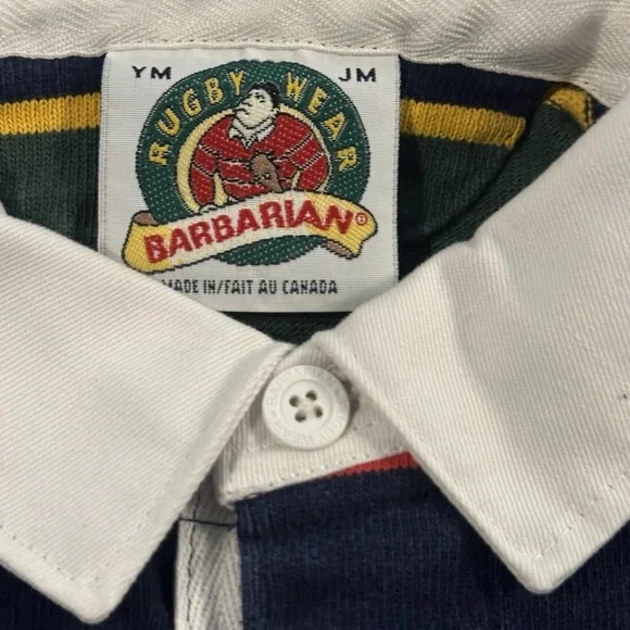 The product is a youth medium long sleeve striped polo shirt from the brand Barbarian Rugby style Queens University long sleeve polo shirt.It features a collared neckline with a spread collar style, a pullover closure, and embroidered accents. The shirt is made from a blend of polyester and cotton, making it suitable for various occasions such as travel, activewear, and casual wear. The multicolor design and retro grunge theme make it a stylish choice for boys who enjoy outdoor activities like rugby, hiking, and skateboarding. With its easy-care features and regular fit, this polo shirt offers both comfort and style for young wearers.